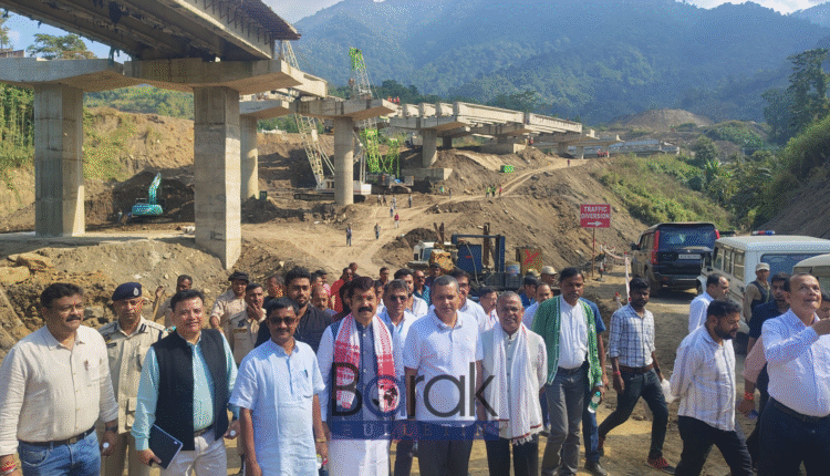 The long-pending work on the East–West Corridor between Harangajao and Jatinga is finally close to completion, assured Barak Valley Development Department Minister Kaushik Rai. On Saturday (November 22), Rai, along with Rajya Sabha MP Kanad Purkayastha, Udharbond MLA Mihir Kanti Shome, and senior officials of the National Highways and Infrastructure Development Corporation Limited (NHIDCL), inspected more than 60 kilometres of the project from Balacherra to Mahur.