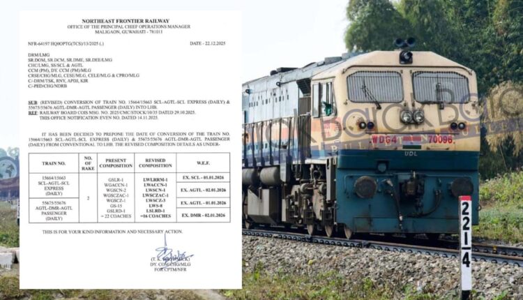 The Northeast Frontier Railway has decided to prepone the conversion of the Silchar–Agartala Express and the Agartala–DMR–Agartala Passenger train from conventional coaches to Linke Hofmann Busch, or LHB, coaches. The revised arrangement will come into effect from the first days of January 2026, according to an official notification issued from NFR headquarters at Maligaon.