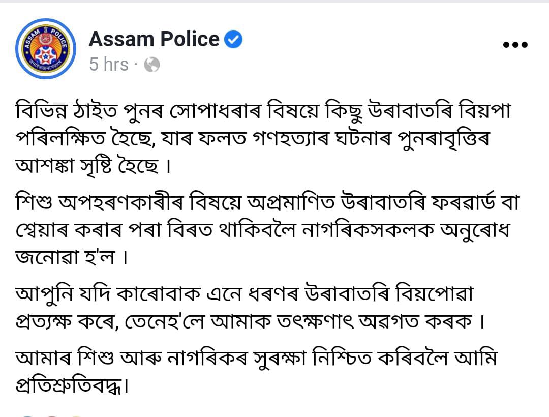 This post and the live stream come after Cachar SP, Numal Mahatta issued a strict warning against spreading such rumours. He said, “There is a group of miscreants who try to breach the peace and tranquillity by spreading such rumours, especially in the rural areas of the district. I urge the public to not fall prey to such attempts.”.