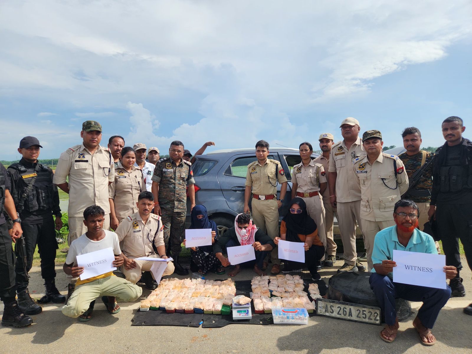 Acting on credible intelligence, a special operation was launched, and a Ford Ecosport Titanium (Registration No. AS-26A-2522), travelling from Churachandpur in Manipur, was intercepted. Three individuals were apprehended from the vehicle, namely: