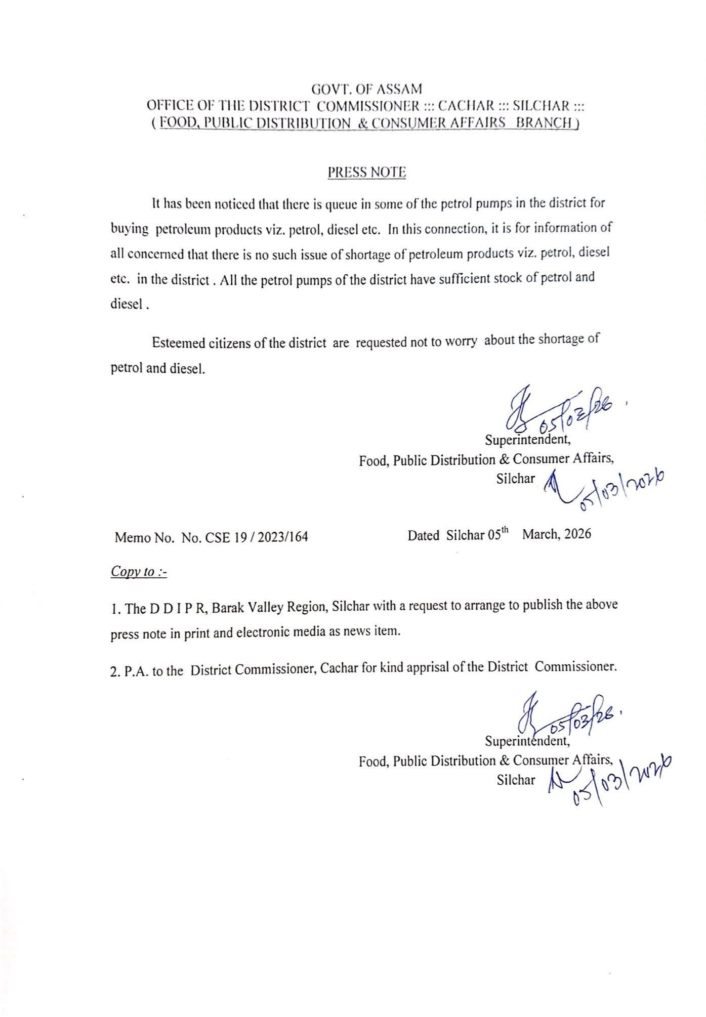 Amid long queues seen at several petrol pumps in Silchar and other parts of Cachar over the last few days, the district administration has clarified that there is no shortage of petrol or diesel in the district.