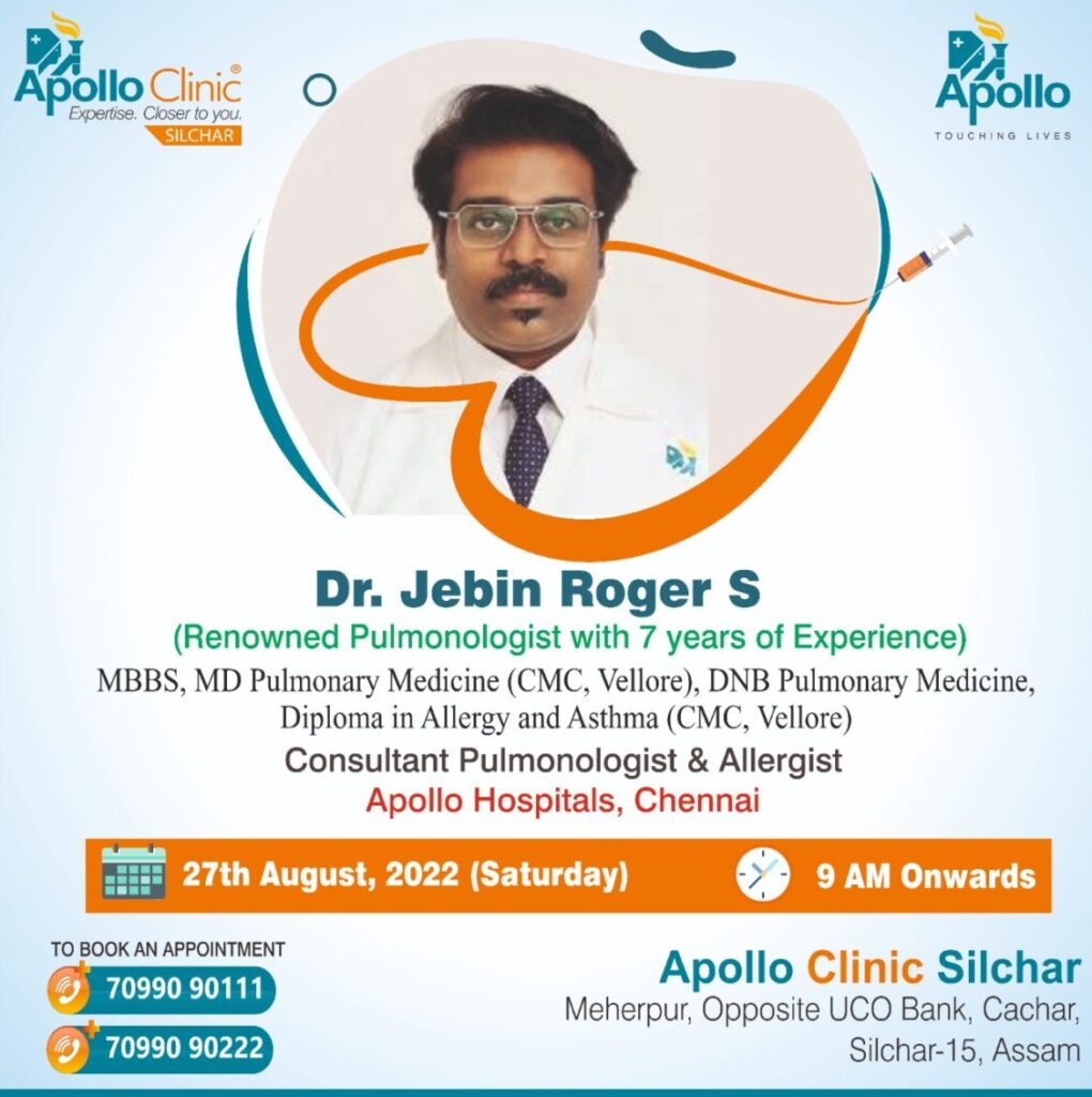 Renowned Pulmonologist Dr. Jebin Roger S, from Apollo Hospital, will be available at Apollo Clinic Silchar (Birbal Bazar, Meherpur) on August 27, 2022. The Apollo Clinic management informed that the doctor will check patients on prior appointments only, and to book appointments one can call 7099003112 or 7099090222 or Visit Apollo Clinic Silchar, Meherpur (Birbal Bazar).