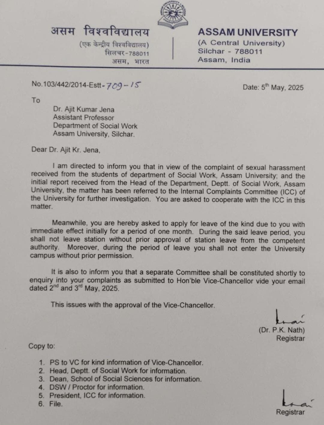 In response, the university issued an official letter signed by Registrar P.K. Nath. The letter stated that based on the complaint from students and an initial report by the Head of the Department of Social Work, the issue has been referred to the ICC for investigation. The professor has been instructed to fully cooperate with the ICC.