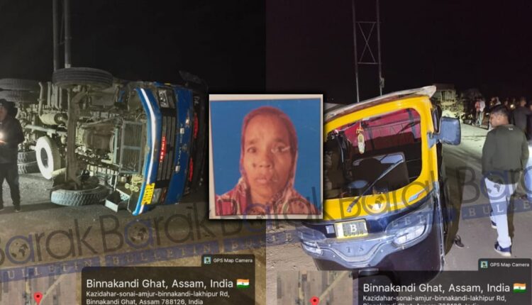 A 60-year-old woman died, and three others, including a pregnant woman, were seriously injured after a passenger auto-rickshaw collided head-on with a stone-laden dumper truck at Binnakandi Ghat in Lakhipur, Cachar, late at night (8 February).